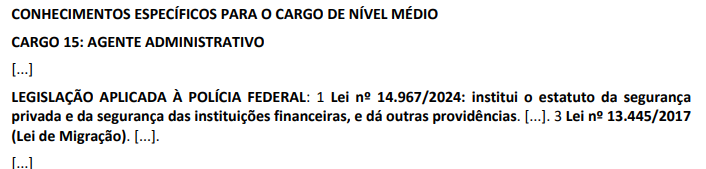 As alterações são referentes ao conteúdo programático do cargo de Agente Administrativo, de nível médio. Agora, o conteúdo relativo à Legislação Aplicada à Polícia Federal (conhecimentos específicos) passa a vigorar com a seguinte redação: