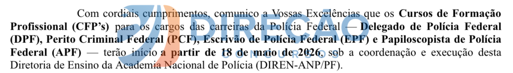 Os Cursos de Formação Profissional (CFPs) do concurso PF têm data de início confirmada: 18 de maio de 2026. A informação consta de Ofício Circular assinado em 8 de abril pela diretora de ensino da Academia Nacional de Polícia (ANP), delegada Christiane Correa Machado, e apurado pelo Direção Concursos.