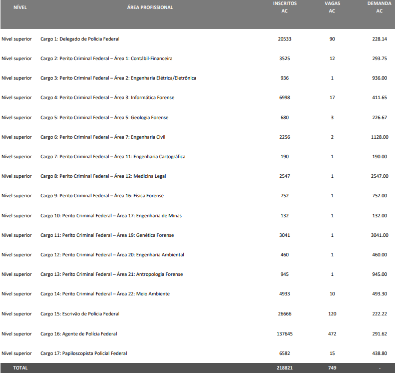De acordo com os dados divulgados nesta sexta-feira (18/7), o cargo de Escrivão oferta 160 vagas de nível superior e contou com a candidatura de 26.666 inscritos. A demanda por vaga atual será de 222.22 candidatos por vaga.