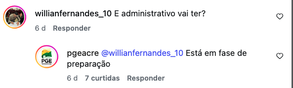 A novidade que chamou atenção dos candidatos veio de uma interação nas redes sociais. Ao ser questionada nos comentários da publicação, a própria PGE AC respondeu: “Está em fase de preparação.”