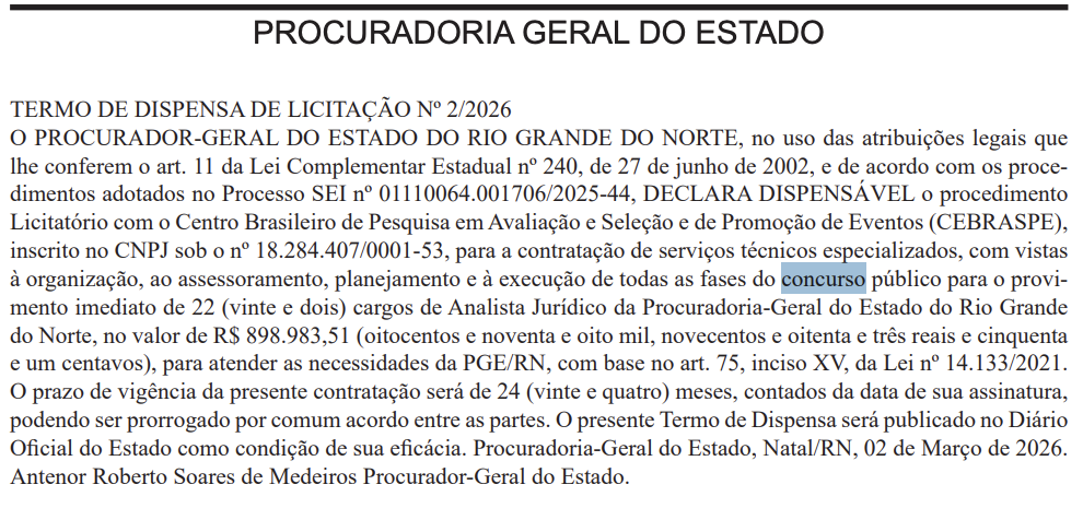 O concurso PGE RN (Procuradoria-Geral do Estado do Rio Grande do Norte) está cada vez mais próximo. Nesta quarta-feira (4/3), foi publicado no Diário Oficial do Estado o Termo de Dispensa de Licitação nº 2/2026, que formaliza a contratação do Cebraspe como banca organizadora do certame.