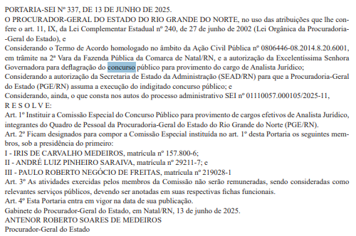 Está formada a comissão organizadora do concurso PGE RN (Procuradoria-Geral do Estado do Rio Grande do Norte) para Analista Jurídico!