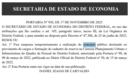 Foi publicada em Diário Oficial do Distrito Federal nesta terça-feira (18/11) a Portaria nº 930, que determina a suspensão temporária do concurso público para a Carreira de Planejamento Urbano e Infraestrutura do DF. A medida foi assinada pelo secretário de Estado de Economia, Daniel Isaías de Carvalho.