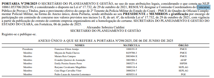 A previsão é de que 3.000 candidatos estejam inscritos para concorrer às oportunidades. Veja os integrantes da comissão do concurso PM CE abaixo: