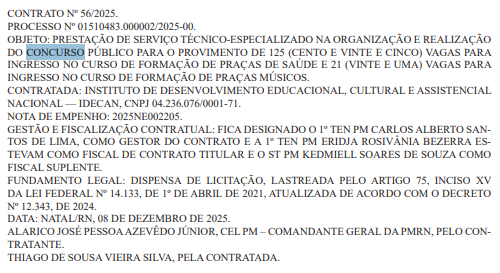 Foi dado um importante passo para a tão aguardada abertura do novo concurso da Polícia Militar do Rio Grande do Norte (PM RN). Nesta quarta-feira (10/12), foi publicado em Diário Oficial do estado, o extrato do contrato que oficializa a banca organizadora responsável por toda a seleção.