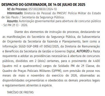 A autorização, publicada em Diário Oficial do estado nesta terça-feira (15/7), contempla 4.400 vagas para Soldado PM de 2ª Classe, a serem distribuídas em dois certames.