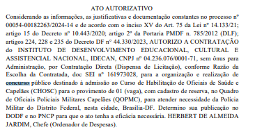 Isso porque foi publicado em Diário Oficial do Distrito Federal nesta sexta-feira (14/3), ato que autoriza a contratação do Idecan como banca organizadora do certame.