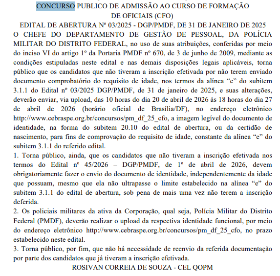 O edital esclarece ainda que candidatos inscritos por meio do Edital nº 45/2026 — publicado em 1º de abril de 2026 — devem obrigatoriamente enviar o documento de identidade, independentemente da idade, sob pena de novo indeferimento. Policiais militares da ativa da PMDF devem realizar o upload da identidade funcional pelo mesmo endereço eletrônico.