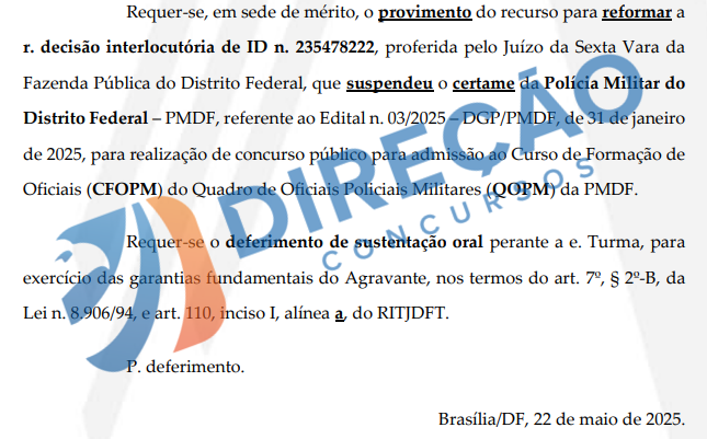 Trata-se de um recurso interposto pela Associação dos Oficiais da Polícia Militar do Distrito Federal (ASOF) em face da decisão que paralisou o andamento do certame da PMDF. O agravo de instrumento pede a retomada do concurso público sem que haja a inclusão de vagas para pessoas com deficiência.
