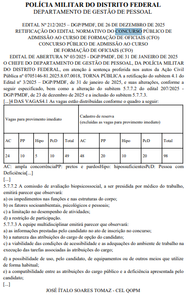 A alteração foi publicada no Diário Oficial do Distrito Federal nesta terça-feira (30/12) por meio do Edital nº 212/2025 – DGPP/PMDF e ajusta o quadro de vagas para o cadastro de reserva, além de incluir um novo item no processo de avaliação de candidatos pessoas com deficiência (PcD).