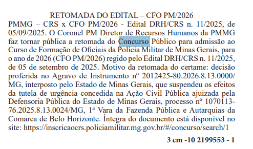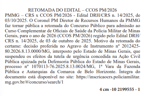 O concurso PMMG (Polícia Militar de Minas Gerais) para o Curso de Formação de Oficiais (CFO) voltou ao trilho. A retomada do certame foi publicada no Diário Oficial do Estado de Minas Gerais (DOE MG) no sábado, 11 de abril de 2026, com base na decisão proferida pelo Tribunal de Justiça de Minas Gerais (TJMG).