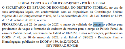 O edital de prorrogação foi publicado no Diário Oficial do Distrito Federal e estabelece a validade do concurso público até 22 de agosto de 2027. Dessa forma, a expectativa é pela convocação de mais aprovados na seleção.