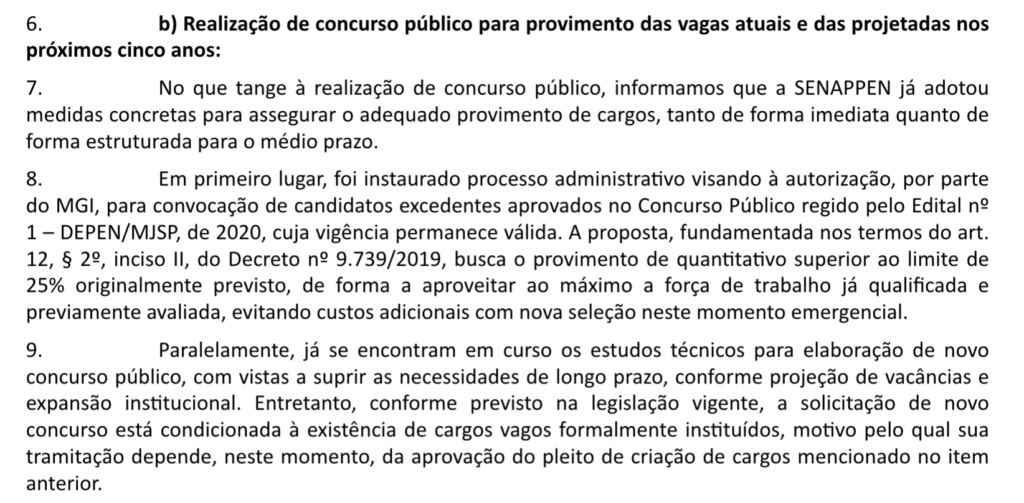 Em documento oficial, a Secretaria Nacional de Políticas Penais (Senappen) informou que já realiza estudos técnicos para elaboração de novo concurso público, com o objetivo de suprir as necessidades de longo prazo, conforme projeção de vacâncias e expansão institucional.