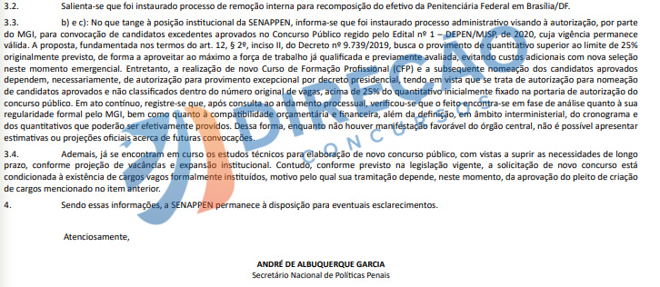 O Secretário André Garcia também mencionou que há um processo de remoção interna em andamento para recompor o efetivo da Penitenciária Federal em Brasília/DF. O objetivo é garantir o funcionamento do sistema penitenciário enquanto os novos concursos são estruturados.