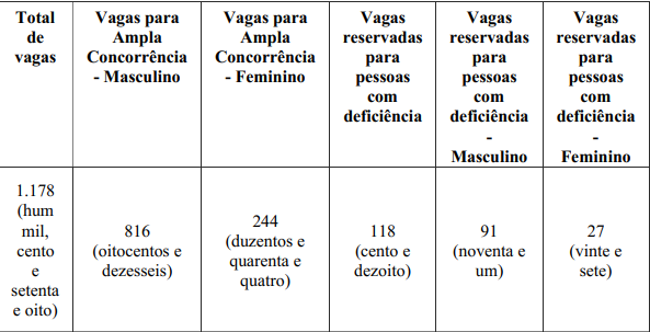 Como mencionado anteriormente, serão ofertadas 1.178 vagas para Policial Penal ao todo, segundo o projeto básico, as oportunidades serão distribuídas da seguinte forma:
