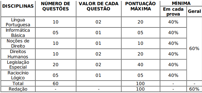 - Prova objetiva e redação: caráter eliminatório e classificatório