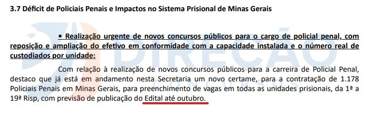 De acordo com o memorando, datado de 17 de setembro, “já está em andamento um novo certame, para a contratação de 1.178 Policiais Penais em Minas Gerais, com previsão de publicação do Edital até outubro”, como é possível ver no trecho abaixo: