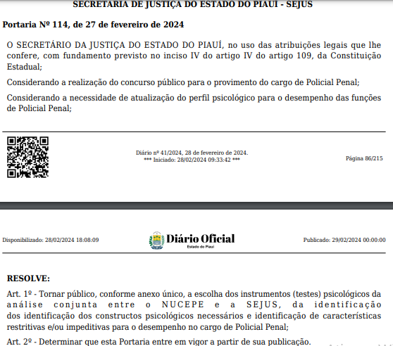 Foi publicada, no Diário Oficial do Piauí desta quarta-feira (28), a escolha de instrumentos psicológicos para traçar a personalidade de candidato desejada no concurso Polícia Penal PI!