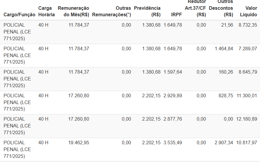 Em consulta ao portal da transparência do estado é possível ver os ganhos reais dos servidores, confira alguns exemplos referentes ao mês de agosto, a seguir: