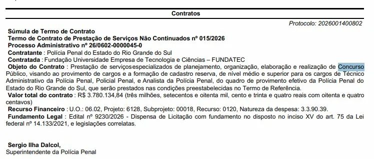 O documento, de Processo Administrativo nº 26/0602-0000045-0, formaliza a contratação da Fundatec para o planejamento, organização, elaboração e realização do concurso público, com valor total de R$ 3.780.134,84.