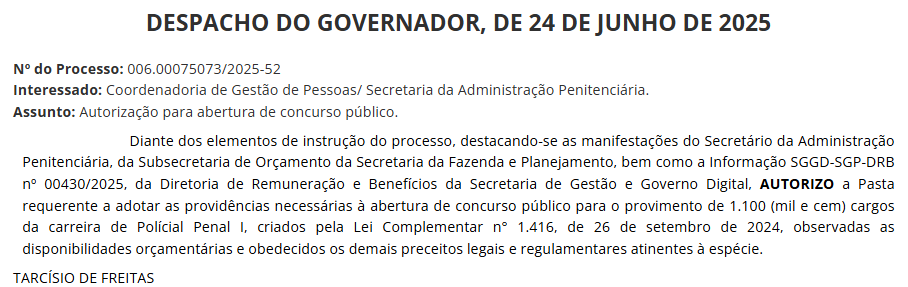O despacho do governador foi publicado em Diário Oficial neste 25 de junho e autoriza a adoção de providências necessárias à abertura do certame para o provimento de 1.100 cargos da carreira de Polícial Penal I, criados pela Lei Complementar n° 1.416, de 26 de setembro de 2024.