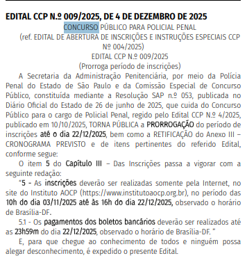 A Secretaria da Administração Penitenciária do Estado de São Paulo anunciou, nesta sexta-feira (5/12), a prorrogação do prazo de inscrições para o concurso Polícia Penal SP. O edital de prorrogação foi publicado no Diário Oficial do estado e estende o período para se inscrever até 22 de dezembro de 2025.