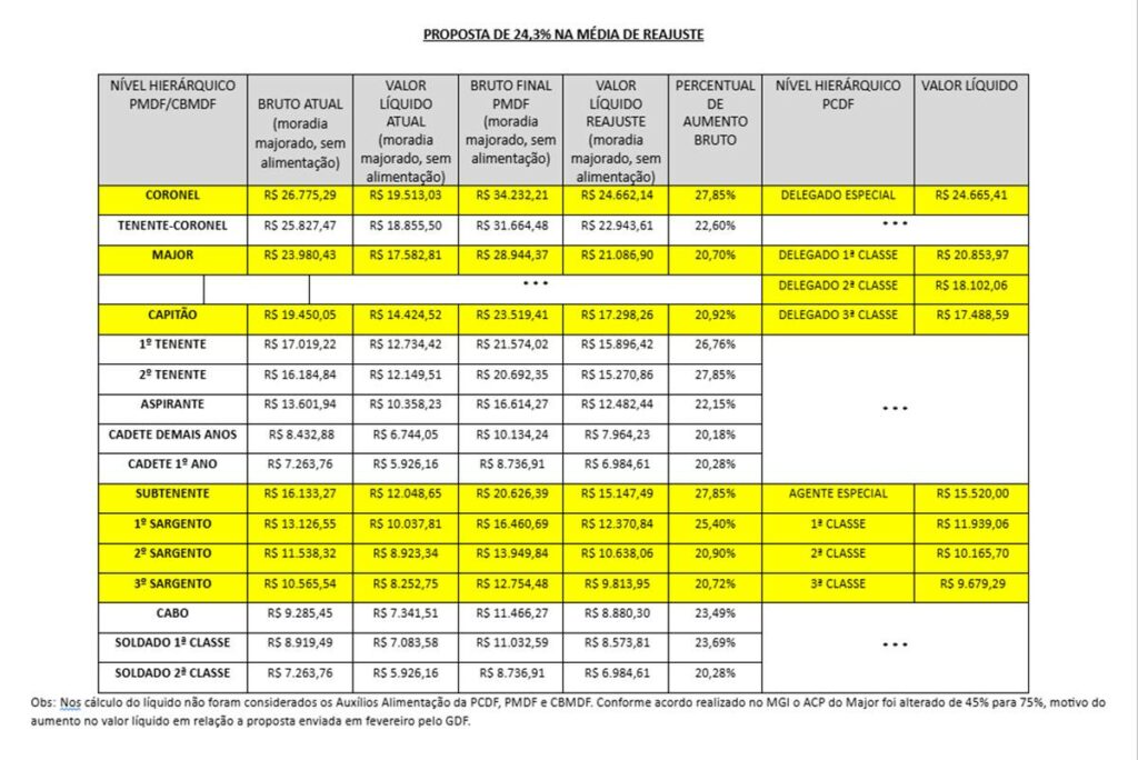 Segundo documento elaborado pelas próprias corporações, os novos valores já estão definidos para todos os níveis hierárquicos da PMDF e do CBMDF.