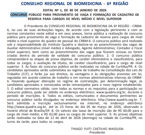 Foi publicado em Diário Oficial da União nesta sexta-feira (30/1), o extrato de edital do concurso CRBM PR (Conselho Regional de Biomedicina da 6ª Região – PR)!