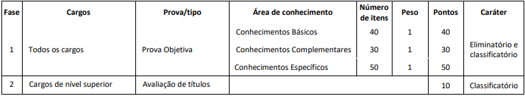 - Prova objetiva, de caráter eliminatório e classificatório, para todos os cargos; e