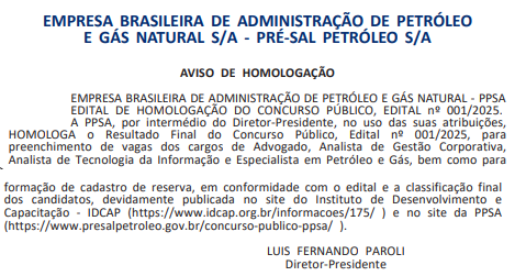 A Empresa Brasileira de Administração de Petróleo e Gás Natural (Pré-Sal Petróleo S/A – PPSA) homologou o resultado final do seu concurso público para cargos em diversas especialidades!