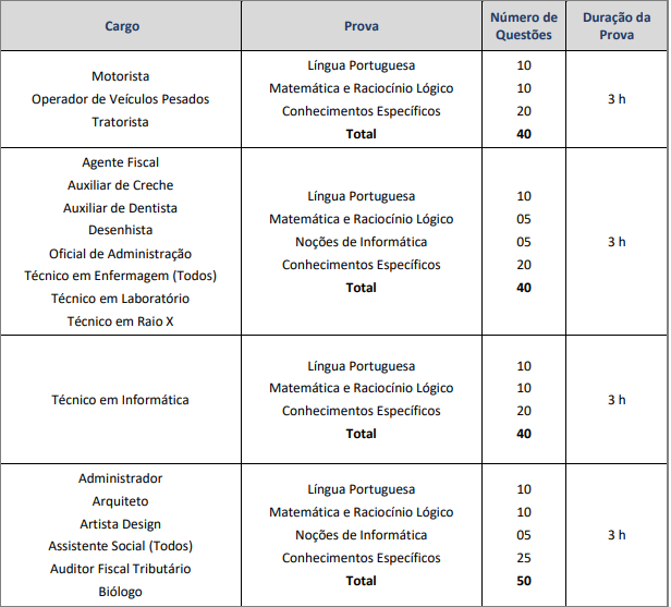 As Provas Objetivas para todos os cargos têm caráter habilitatório (eliminatório) e classificatório, exceto para os cargos de Médicos (todas especialidades), cuja Prova Objetiva será apenas de caráter classificatório, e constarão de questões objetivas de múltipla escolha, com cinco alternativas cada uma, sendo que apenas uma será considerada correta.