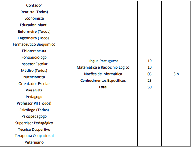 - Para os cargos de Educador Infantil, Inspetor Escolar, Orientador Escolar, Professor PII (Todos), Psicopedagogo e Supervisor Pedagógico: