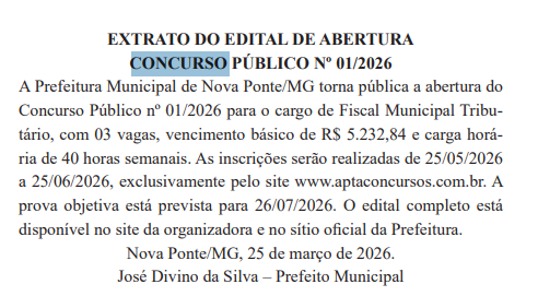 A Prefeitura Municipal de Nova Ponte (MG) publicou o Extrato do Edital de Abertura do Concurso Público nº 01/2026. A seleção oferta 3 vagas para o cargo de Fiscal Municipal Tributário, com vencimento básico de R$ 5.232,84 e carga horária de 40 horas semanais.