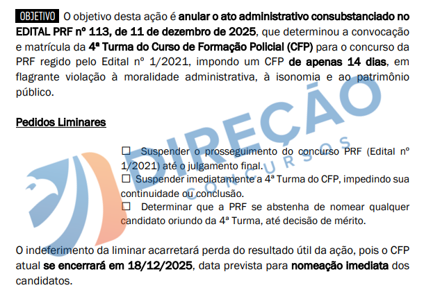 A ação judicial, pede a anulação do Edital PRF nº 113/2025 e a suspensão liminar do curso, alegando lesão à moralidade administrativa e violação ao princípio da isonomia. O autor contrasta os 14 dias da 4ª turma com a duração das turmas anteriores:
