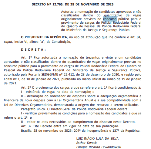 Foi publicada em Diário Oficial da União nesta segunda-feira (1/12) a autorização para a nomeação de 321 candidatos aprovados e não classificados dentro das vagas originais do último concurso PRF (Polícia Rodoviária Federal). A medida consta do Decreto nº 12.765, assinado pelo Presidente da República, e representa um passo decisivo para a convocação da tão aguardada nova turma de Policiais Rodoviários Federais.