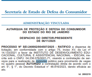 O concurso público para o Procon RJ (Autarquia de Proteção e Defesa do Consumidor do Estado do Rio de Janeiro) deu mais um passo decisivo. Em despacho publicado no Diário Oficial do estado nesta sexta-feira (7/11), o diretor-presidente da autarquia, Marcelo de Almeida, ratificou a dispensa de licitação e autorizou a contratação direta do Idecan para organizar o certame.
