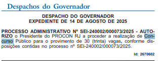 O governador Cláudio Castro autorizou oficialmente a realização de um novo concurso para o Procon RJ (Autarquia de Proteção e Defesa do Consumidor do Estado do Rio de Janeiro). A decisão foi publicada no Diário Oficial do estado nesta sexta-feira (15/8) e prevê a oferta de 30 vagas efetivas.