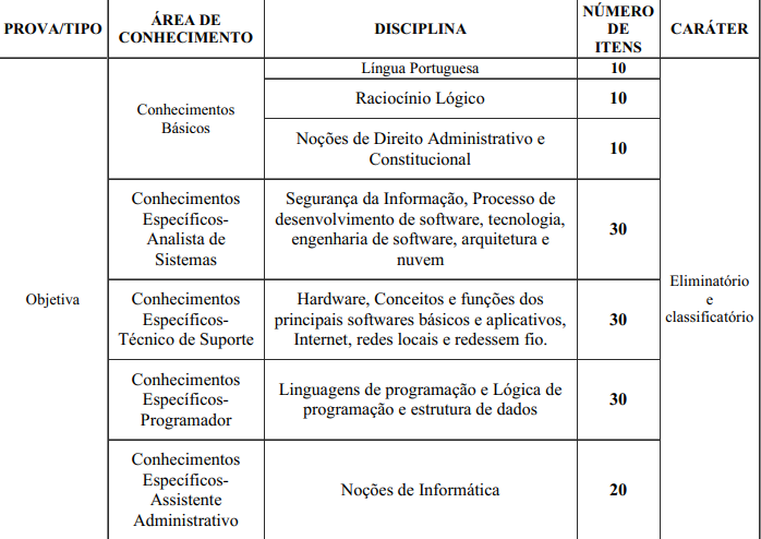 Requisitos: Nível superior em Ciências da Computação, Engenharia da Computação, Sistemas de Informação e demais cursos de graduação da na área de TIC, reconhecido e concluído em instituição de nível superior credenciada pelo Ministério da Educação (MEC).