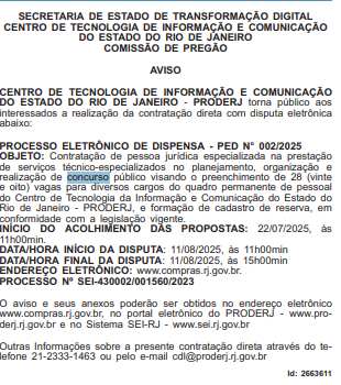 Foi iniciado o processo de escolha da banca organizadora do concurso Proderj (Centro de Tecnologia de Informação e Comunicação do Estado do Rio de Janeiro)!