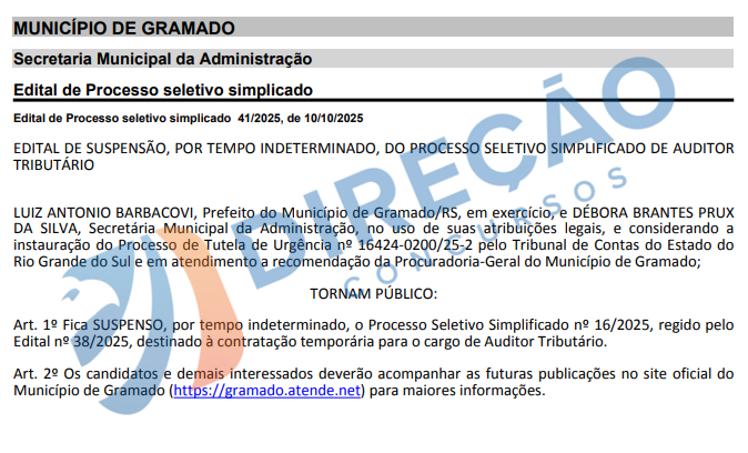 A Prefeitura Municipal de Gramado, no Rio Grande do Sul, suspendeu por tempo indeterminado o concurso público que visava à contratação temporária de Auditores Tributários. A decisão, publicada em Diário Oficial de Gramado, no dia 10 de outubro, atende a uma recomendação da Procuradoria-Geral do Município e está vinculada à instauração de um Processo de Tutela de Urgência pelo Tribunal de Contas do Estado (TCE RS).