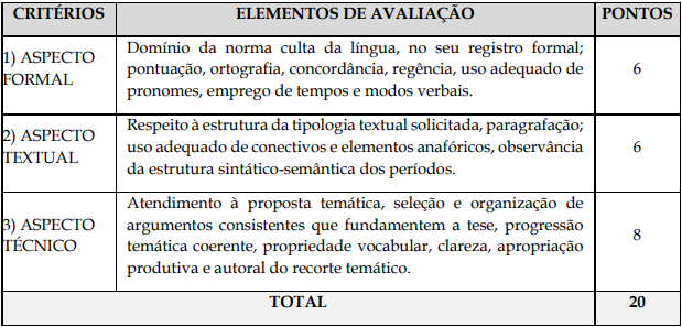 Para efeito de avaliação da Prova Discursiva/Redação serão considerados os elementos de avaliação descritos abaixo: