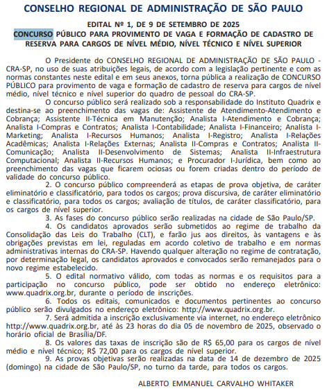 Foi publicado em Diário Oficial da União nesta quarta-feira (10/9), o extrato de edital do concurso público do CRA SP (Conselho Regional de Administração de São Paulo)!
