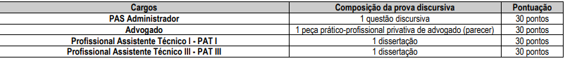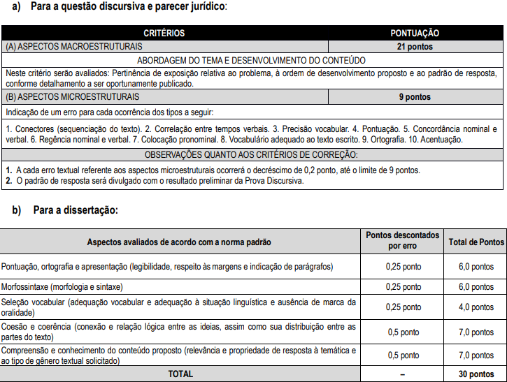 A Prova Discursiva, de caráter eliminatório e classificatório, será avaliada na escala de 0 (zero) a 30 (trinta) pontos.