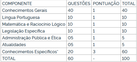 - Critério de Classificação/Eliminação: O candidato deve obter pelo menos 50% do total de pontos da Prova Objetiva e não zerar em nenhum dos componentes (Conhecimentos Gerais ou Conhecimentos Específicos), sob pena de eliminação.