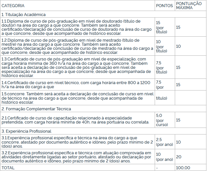 - Experiência Profissional (específica e técnica na área do cargo e atuação no setor portuário).