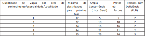 Serão convocados para a Prova Prática até quantitativo máximo de candidatos aos cargo de Técnico de Laboratório/Área Eletroeletrônica conforme o quadro abaixo que obtiverem o mínimo de 50 (cinquenta pontos) do total de pontos na prova objetiva e não obtiver pontuação 0 (zero) em qualquer área de conhecimento.