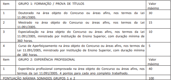 A prova títulos seguirá os seguintes critérios definidos no quadro abaixo: