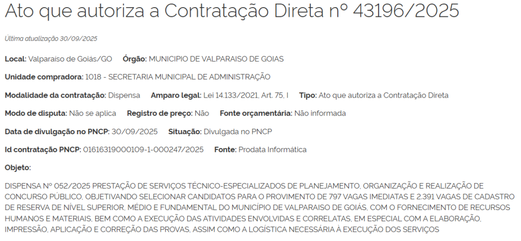 O ato que autorização a contratação do Instituto Verbena como responsável pela seleção foi publicado no Portal Nacional de Contratações Públicas neste 30 de setembro.