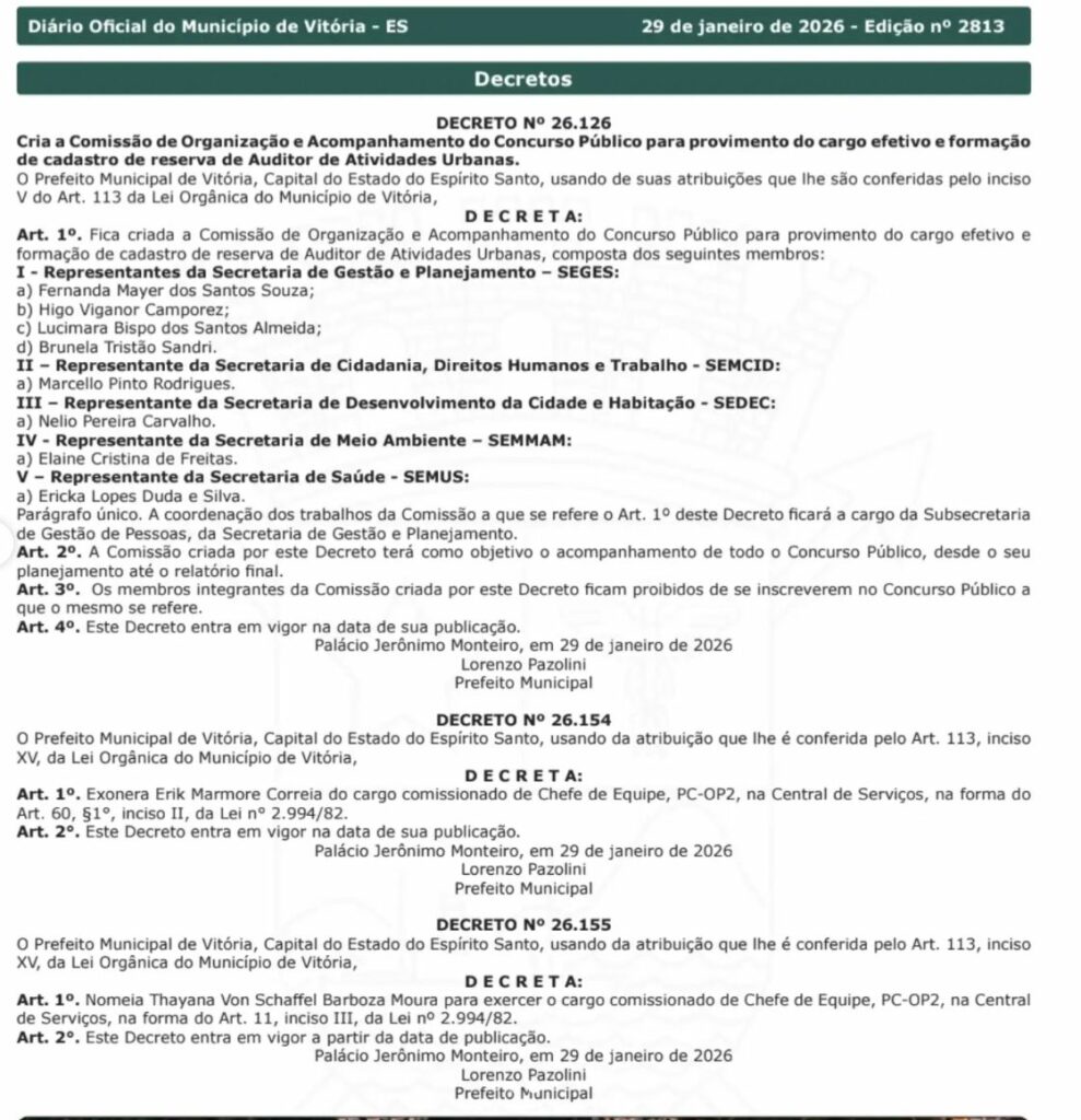 A Prefeitura de Vitória (ES) avançou no concurso para Auditor de Atividades Urbanas com a publicação do Decreto nº 26.126 no Diário Oficial do Município. A medida institui a comissão organizadora, anunciada pelo prefeito Lorenzo Pazolini nesta quinta-feira (29/1).