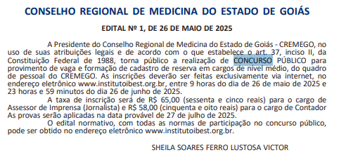 O último edital de concurso CREMEGO foi publicado em 2024. Organizado pela banca ABCP, o certame ofertou duas vagas imediatas, além de formação de cadastro reserva para Assistente de Informática e Advogado. O salário inicial foi de até R$ 7.191,02.